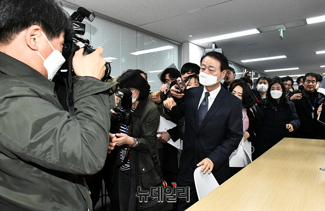 한선교 미래한국당 대표가 19일 오후 서울 영등포구 미래한국당 당사에서 열린 당 대표직 사퇴 기자회견을 마친 뒤 당사를 나서고 있다. 이날 한국당 비례대표 후보자 추천 명단은 선거인단에 의해 부결됐다.