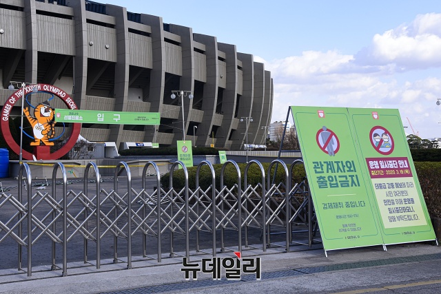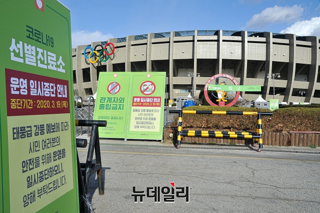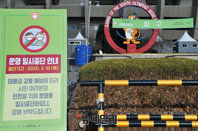 기상청이 강풍주의보를 강풍경보로 격상한 19일 오후 서울 송파구 잠실종합운동장에 위치한 차량 이용 선별진료소에 일시중단 안내문이 붙어있다.