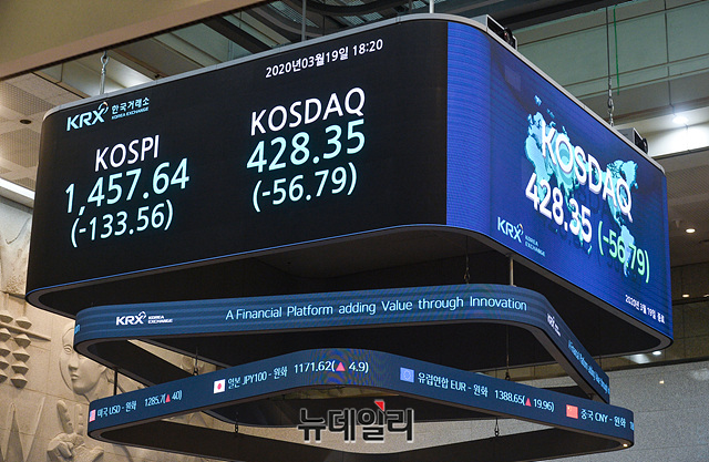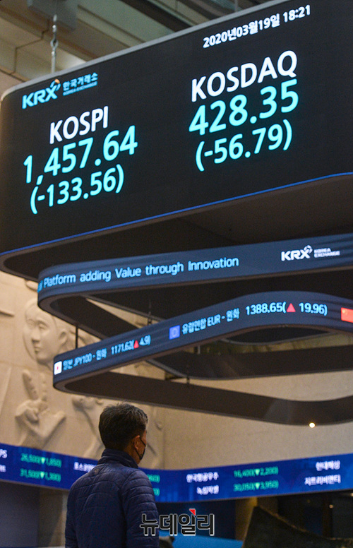 '코로나19(중국 우한 폐렴)' 공포로 인해 코스피 1,500선이 무너진 19일 오후 서울 영등포구 KRX한국거래소 서울사무소에서 직원들이 코로나19 예방을 위해 마스크를 착용한 채 사무소를 나서고 있다.이날 장중 코스피·코스닥지수가 동시에 8% 넘게 폭락하면서 두 시장의 거래를 일시 중단시키는 '서킷브레이커'가 발동됐다.'서킷브레이커'는 주식시장에서 주가가 급등락할 때 시장의 충격을 완화하기 위해 주식매매를 일시 정지하는 제도다.이날 오후 국내 코로나19 현황은 △확진환자 8,565명 △검사진행 15,904 △사망자 91명으로 집계됐다.