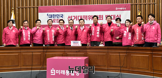 황교안 미래통합당 대표, 심재철 원내대표, 공동선대위원장, 권역별 선대위원장, 최고위원 등이 20일 오전 국회에서 열린 제21대 국회의원 선거 중앙선거대책위원회 발대식에서 기념촬영을 하고 있다.