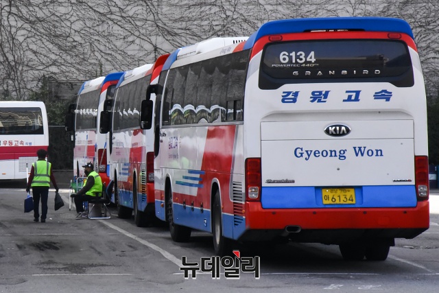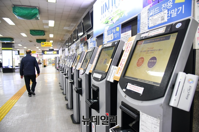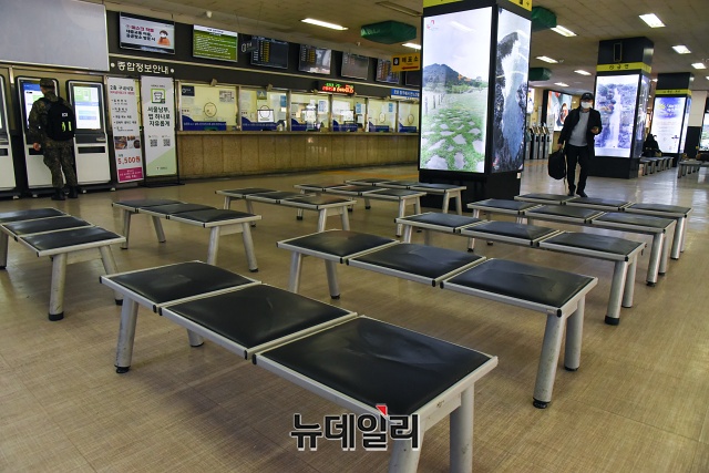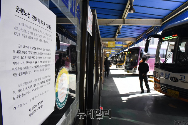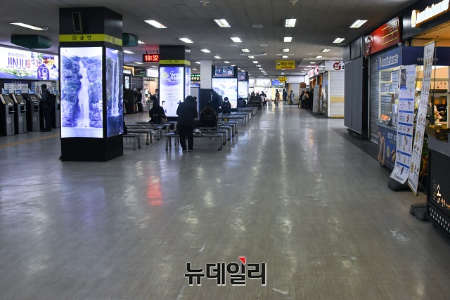 '코로나19(중국 우한 폐렴)'가 장기화 되고 있는 19일 오전 서울 서초구 남부터미널이 한산한 모습을 보이고 있다.한 버스기사는 "코로나19 때문에 (승객이) 많이 줄어 1~2명 태우고 이동할 때가 많다"고 했다.정부는 "코로나19로 인한 승객 감소로 어려움을 겪고 있는 노선버스에 대해 한시적으로 고속도로 통행료를 면제하겠다"고 밝혔다.고속도로 통행료 면제 조치는 고속·시외·광역버스를 대상으로(전세버스 제외) 하이패스 이용차량에 적용된다. 19일부터 '코로나19' 위기경보 단계가 '심각'에서 '경계'로 전환되는 당일 24시까지 적용된다. 또 위기경보 단계와 별개로 최소 1개월(4월18일) 면제 조치가 적용된다.