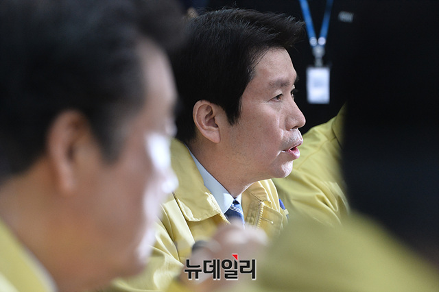 이인영 더불어민주당 원내대표가 20일 오전 국회에서 열린 코로나19 국난극복위원회-선거대책위원회 연석회의에서 모두발언을 하고 있다.