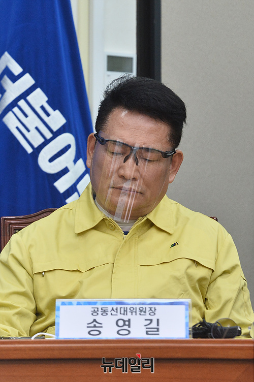 송영길 더불어민주당 공동선대위원장이 20일 오전 국회에서 열린 코로나19 국난극복위원회-선거대책위원회 연석회의에서 '코로나19(중국 우한 폐렴)'을 예방하기 위해 안면 보호막을 착용한 채 자리하고 있다.