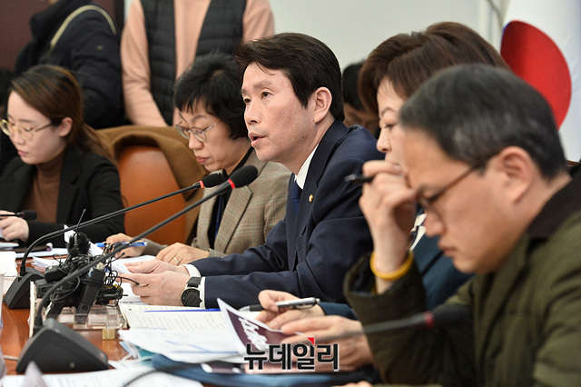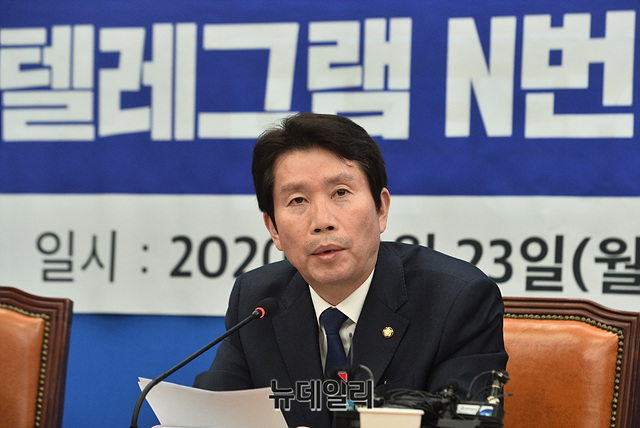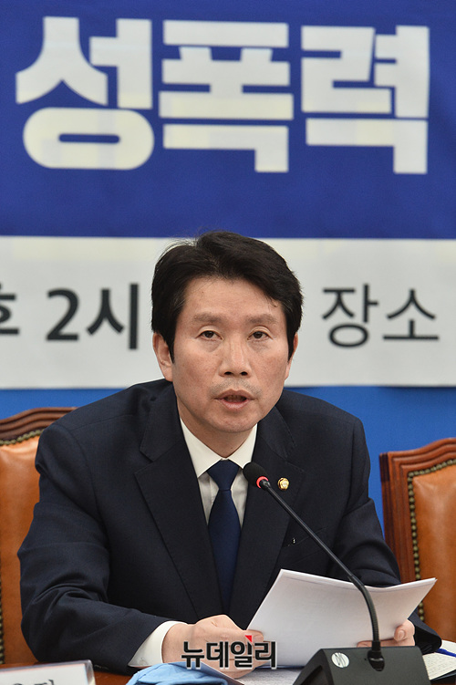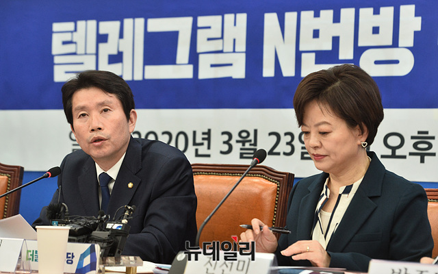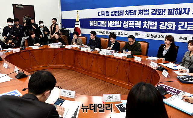 이인영 더불어민주당 원내대표가 23일 오후 국회에서 열린 텔레그램 N번방 성폭력 처벌 강화 긴급 간담회에서 모두발언을 하고 있다.