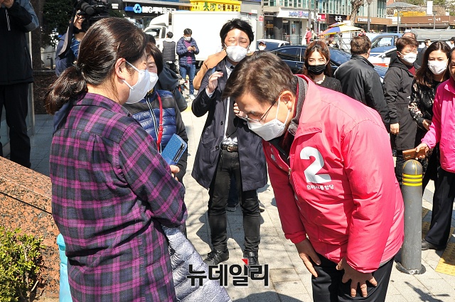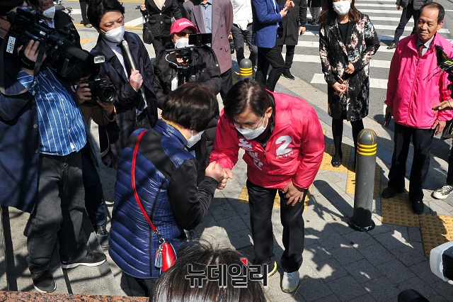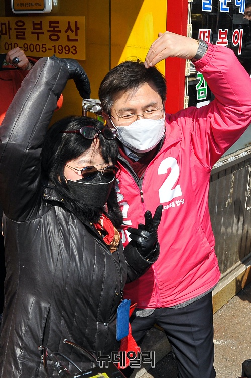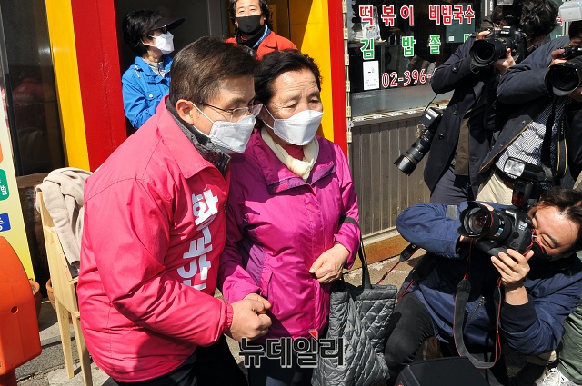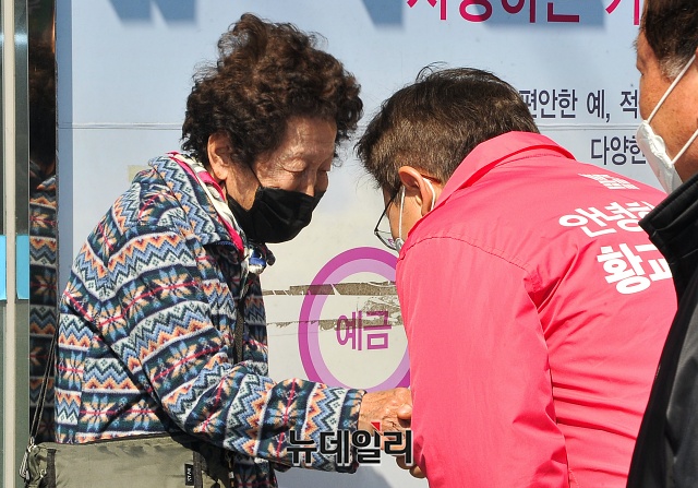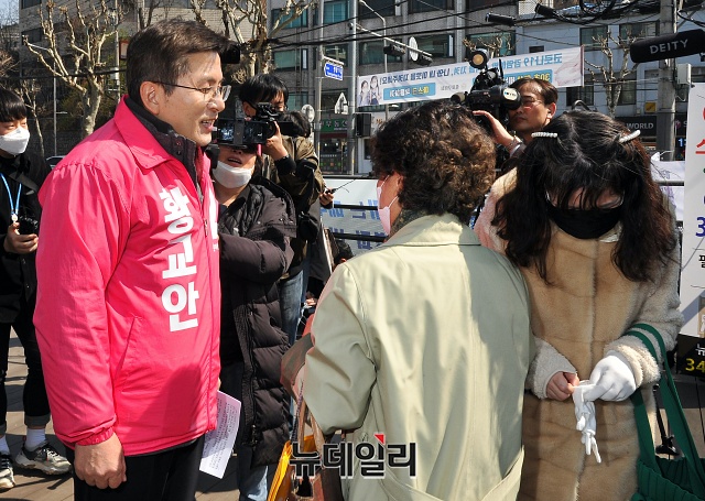 4.15 총선에서 서울 종로구에 출마하는 황교안 미래통합당 대표가 23일 오후 서울 종로구 세검정 새마을금고 본점 앞에서 '종로지역 교통환경 개선'을 위한 공약 발표를 마친 뒤, 주민들과 기념촬영을 하고 있다.
