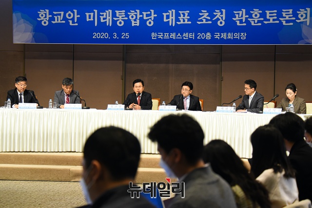 황교안 미래통합당 대표가 25일 오전 서울 중구 프레스센터에서 열린 관훈클럽 초청 토론회에 참석해 패널들의 질문에 답하고 있다. 이날 토론회는 미래통합당 비례정당에 대한 입장과 총선 주요내용, '코로나19(중국 우한 폐렴)' 대응을 위한 여야 협력 등을 주제로 진행됐다.