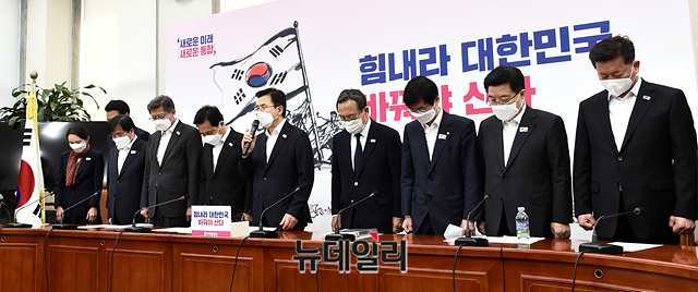 황교안 미래통합당 대표, 심재철 원내대표, 신세돈·박형준 공동선대위원장 등 참석자들이 26일 오전 국회에서 열린 중앙선거대책위원회의에 앞서 천안함 피격 10주기를 맞이해 천안함 46용사에 대한 묵념을 하고 있다.