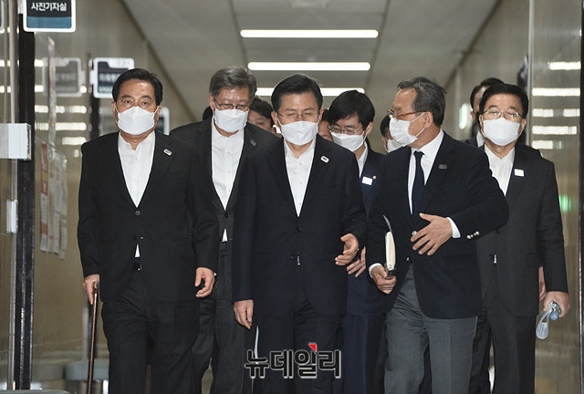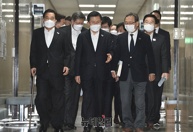 황교안 미래통합당 대표, 심재철 원내대표, 신세돈·박형준 공동선대위원장 등 지도부가 26일 오전 국회에서 열린 중앙선거대책위원회의에 입장하고 있다.