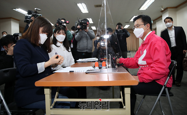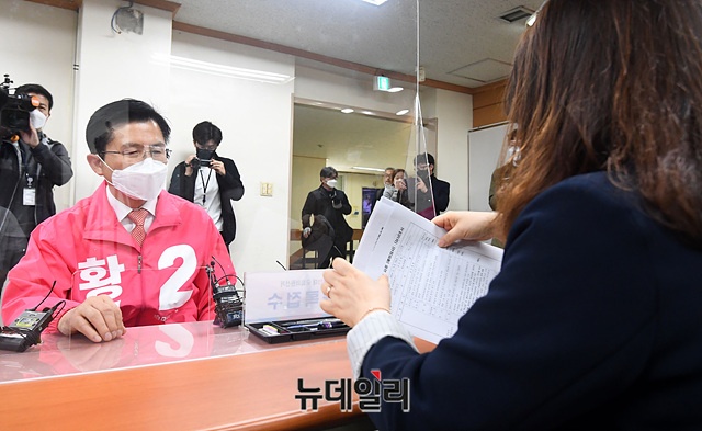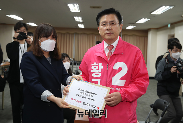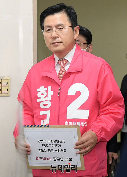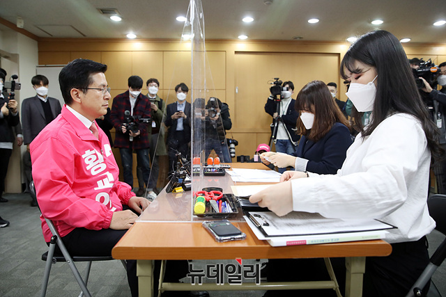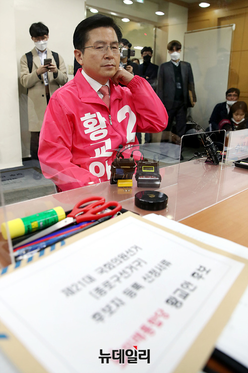 제21대 총선 서울 종로구에 출마하는 황교안 미래통합당 대표가 26일 오전 서울 종로구 선거관리위원회에서 후보자등록 접수를 하고 있다.