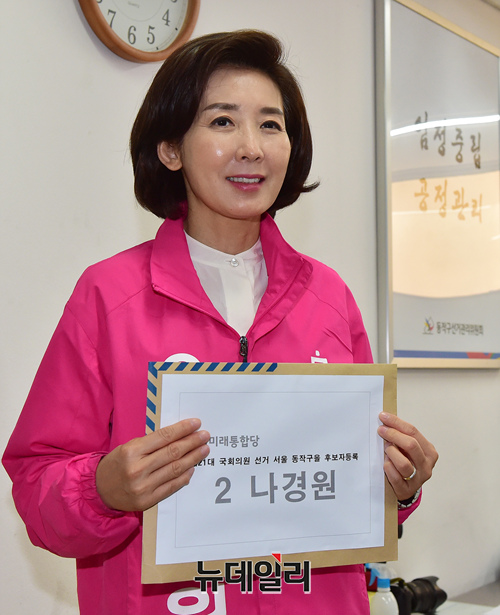 나경원 미래통합당 동작을 후보가 26일 오전 21대 총선 후보등록을 하기 위해 서울 동작구 선관위에 들어서고 있다