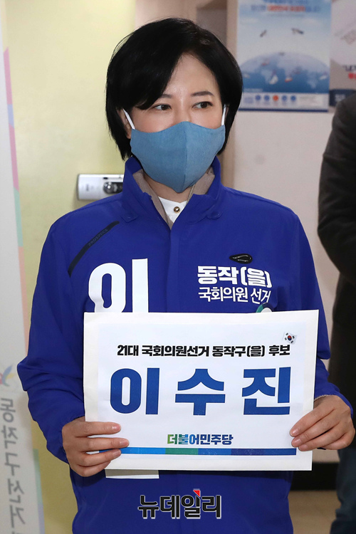 이수진 더불어민주당 동작을 후보가 26일 오전 21대 총선 후보등록을 하기 위해 서울 동작구 선관위에 들어서고 있다.