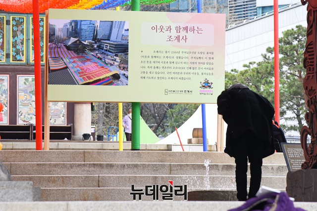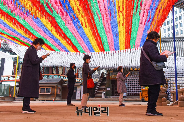 [포토] 조계사서 거리두고 불경 보는 시민들