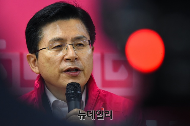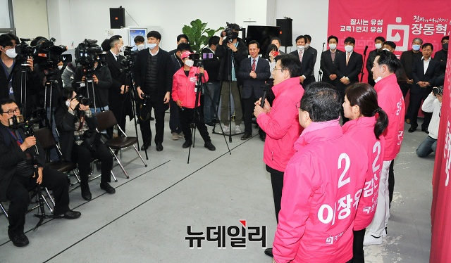 황교안 미래통합당 대표가 27일 오전 대전 유성구 유성갑 선거사무소를 찾아 후보자들을 격려하고 인사말을 하고 있다.(대전=권창회 기자)