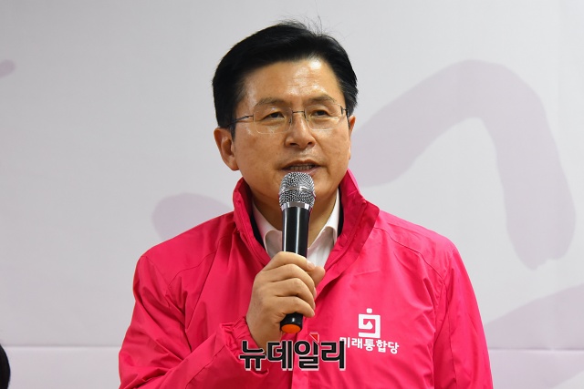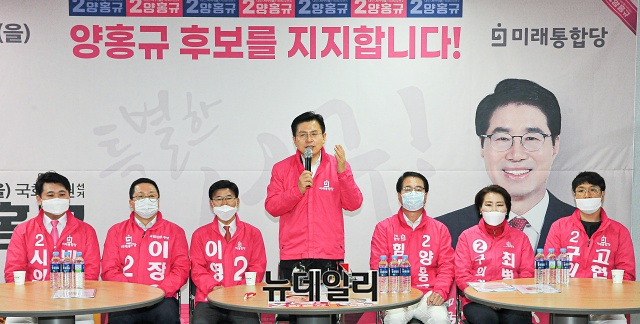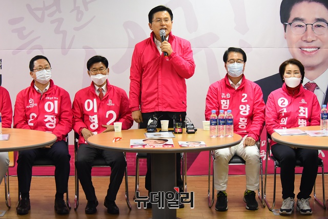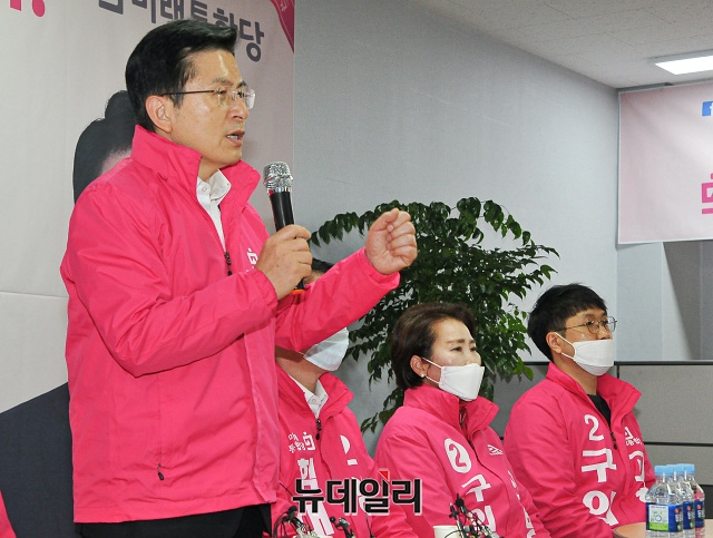 황교안 미래통합당 대표가 27일 오전 대전 서구 서구을 선거사무소를 찾아 후보자들을 격려하고 인사말을 하고 있다.(대전=권창회 기자)