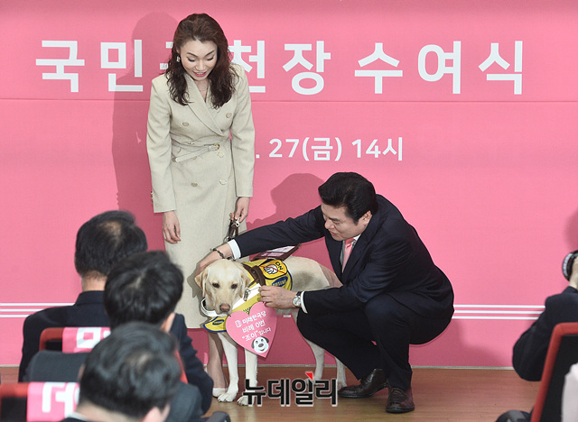원유철 미래통합당 대표가 27일 서울 영등포구 한국당 중앙당사에서 열린 '국민 공천장 수여식'에서 안내견 '조이'에게 비례대표 '0번'의 공천장을 수여하고 기념촬영을 하고 있다. '조이'는 시각장애인 김예지 비례대표 후보의 안내견이다.이날 이종성, 한무경, 윤창현, 김란숙, 신민아, 김경애, 김영근, 김보람, 박대성, 문혜정, 남영호, 권신일, 박현정, 우신구, 최영희, 노용호, 허은아, 이용, 서정숙, 정운천, 최승재, 이영, 지성호, 김예지, 박대수, 신원식, 정경희, 조태용 등이 공천장을 수여받았다.