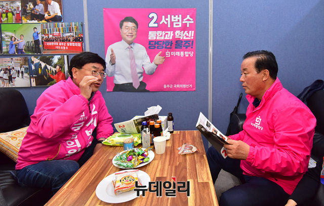 박맹우, 정갑윤 미래통합당 의원이 28일 오후 울산 울주군에 출마하는 서범수 후보 선거사무소를 각각 방문해 대화를 나누고 있다. (울산 울주=정상윤 기자)
