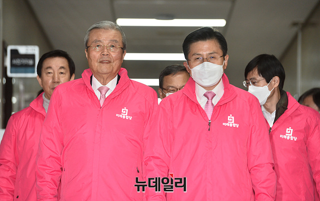 황교안 미래통합당 대표, 김종인 총괄선대위원장 등 지도부가 30일 오전 국회에서 열린 중앙선거대책위원회의에 입장하고 있다.