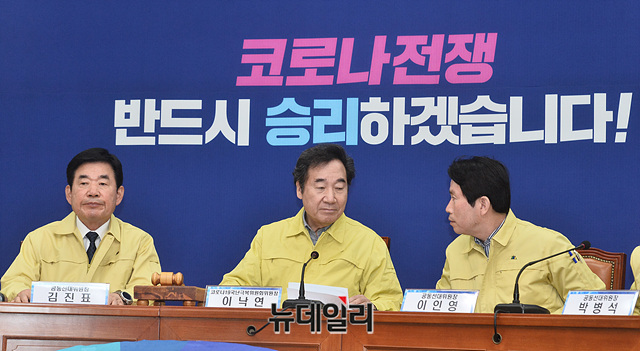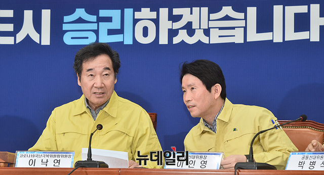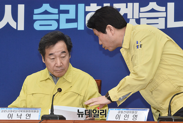 이낙연 더불어민주당 코로나19국난극복위원회 위원장과 이인영 원내대표가 30일 오전 국회에서 열린 민주당 중앙선거대책위원회-코로나19국난극복위원회 연석회의에서 대화를 나누고 있다.