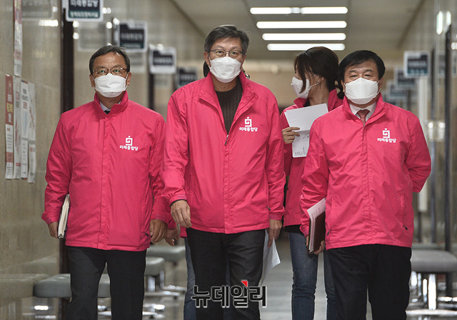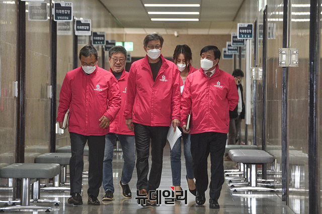 박형준·신세돈 미래통합당 공동 선거대책위원장 등 참석자들이 31일 오전 국회에서 열린 선거전략대책회의에 입장하고 있다.