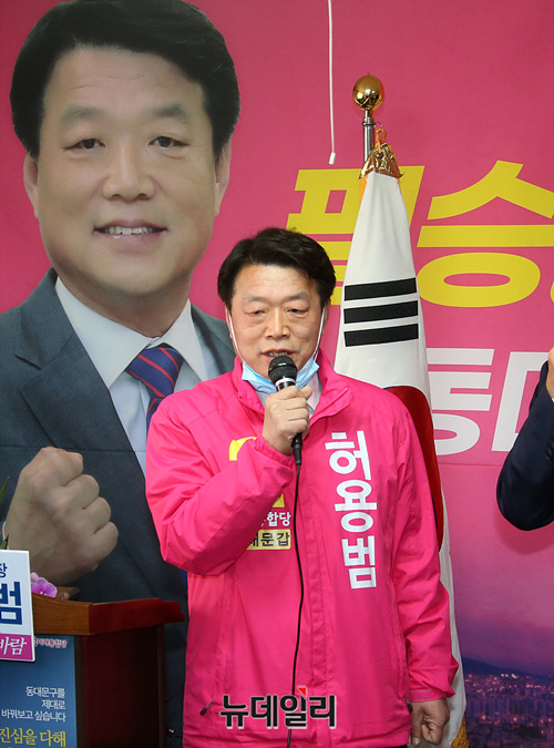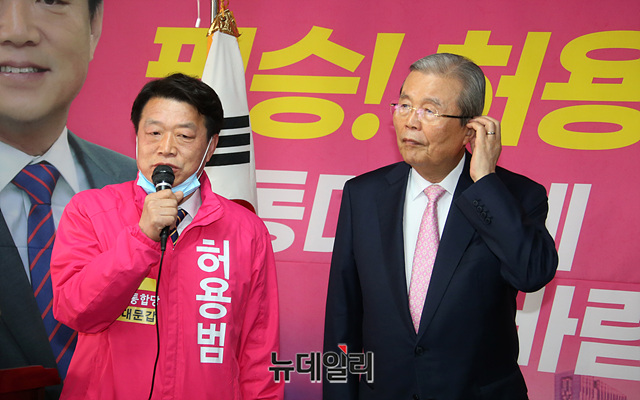 허용범 미래통합당 제21대 총선 동대문갑 후보자가 31일 오전 서울 동대문구 허 후보 선거사무실에서 김종인 통합당 총괄선대위원장의 격려에 인사말을 하고 있다.