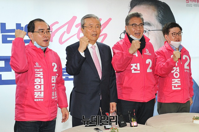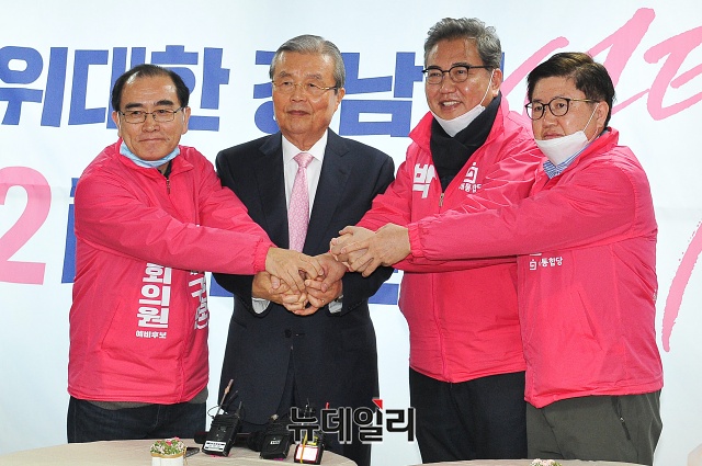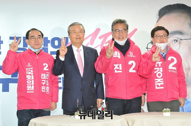 김종인 미래통합당 총괄선거대책위원장이 31일 오전 서울 강남구 강남갑 선거사무소에서 태구민 강남갑 후보, 박진 강남을 후보, 유경준 강남병 후보와 총선승리를 다짐하고 있다.