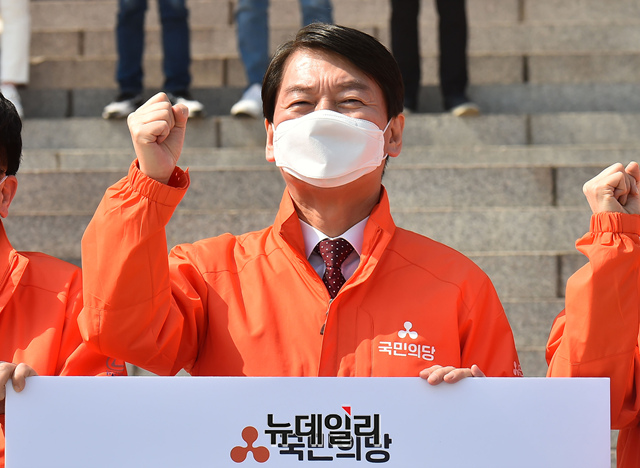 안철수 국민의당 대표와 당원들이 31일 오후 국회 본청 앞 계단에서 열린 국민의당 선거대책위원회 출범식에서 총선승리 퍼포먼스를 하고 있다.