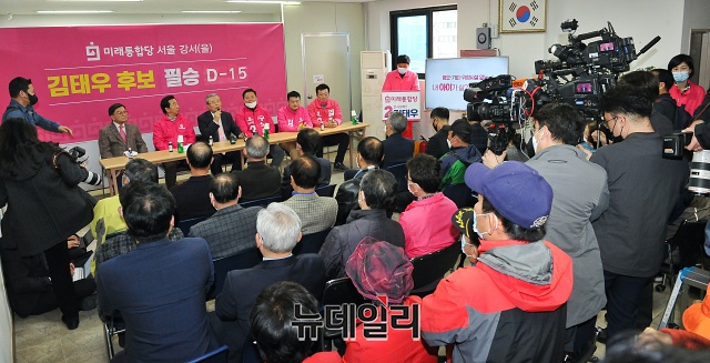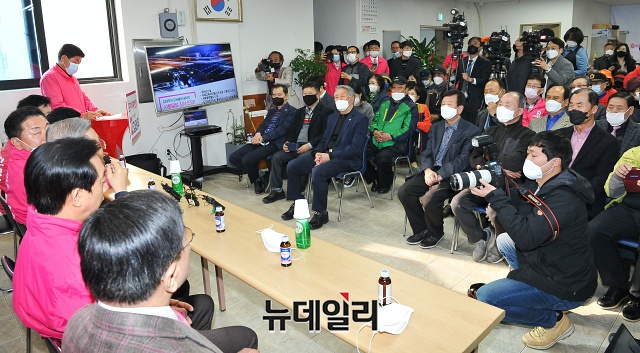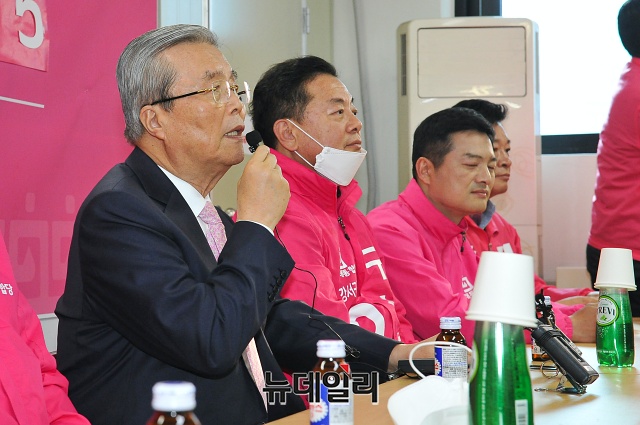 김종인 미래통합당 총괄선거대책위원장이 31일 오후 서울 강서구 강서을 선거사무소를 찾아 후보자들을 격려하고 있다.