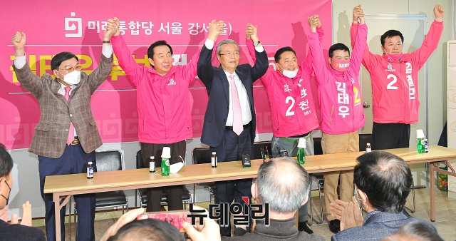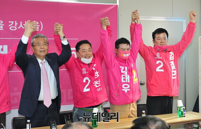 김종인 미래통합당 총괄선거대책위원장이 31일 오후 서울 강서구 강서을 선거사무소에서 구상찬 강서갑 후보, 김태우 강서을 후보, 김철근 강서병 후보와 총선승리를 다짐하고 있다.