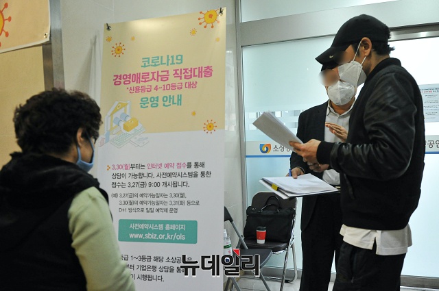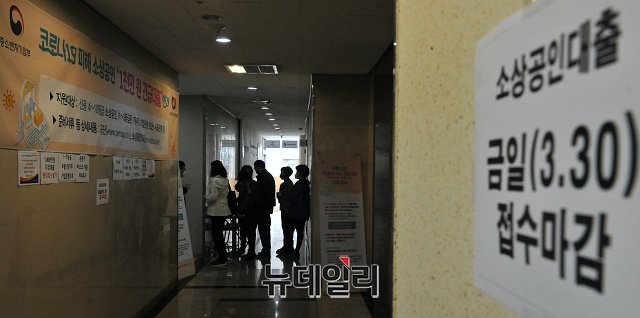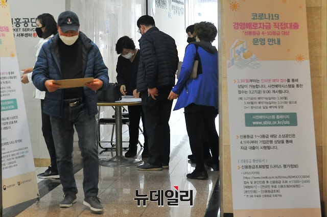 '코로나19(중국 우한 폐렴)'이 장기화 되고 있는 31일 오후 서울 영등포구 소상공인시장진흥공단 서울서부센터에 소상공인들이 '코로나19 피해 경영안정자금 대출' 상담을 받기 위해 대기하고 있다.'코로나19 피해 경영안정자금 대출'은 시중은행, 보증기관을 거치지 않고, 신용만으로 영세 소상공인들에게 최대 1천만원의 긴급대출을 하는 제도다. 4~10등급 소상공인들이 1천만원까지 1.5% 금리로 대출이 가능하다.대출 받으려는 소상공인의 출생년도 끝자리에 따라 짝수일에는 짝수년, 홀수일에는 홀수년생이 상담신청을 받을 수 있다. '홀짝제' 외에 스마트대기시스템, 무인민원서류 발급기 설치, 제출서류 대폭 간소화 등을 보완해 4월 1일부터 시행한다.