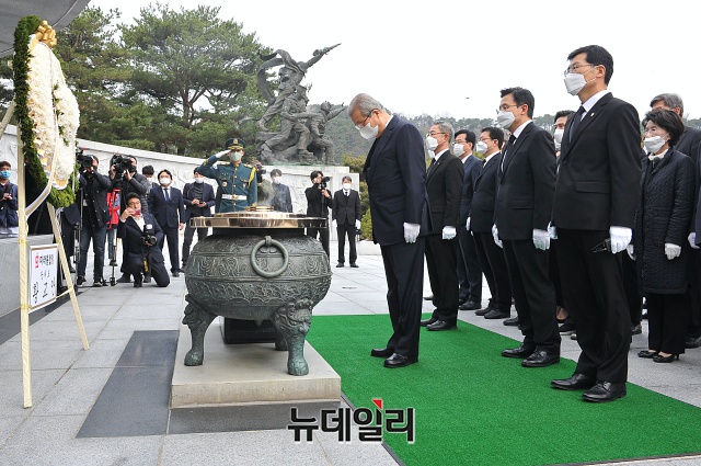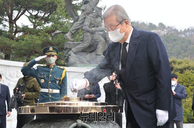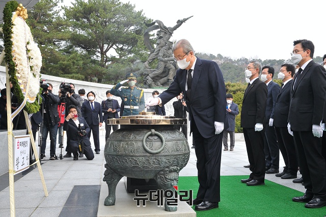 김종인 미래통합당 총괄선거대책위원장이 1일 오전 서울 동작구 국립서울현충원을 찾아 현충탑에 분향하고 있다.