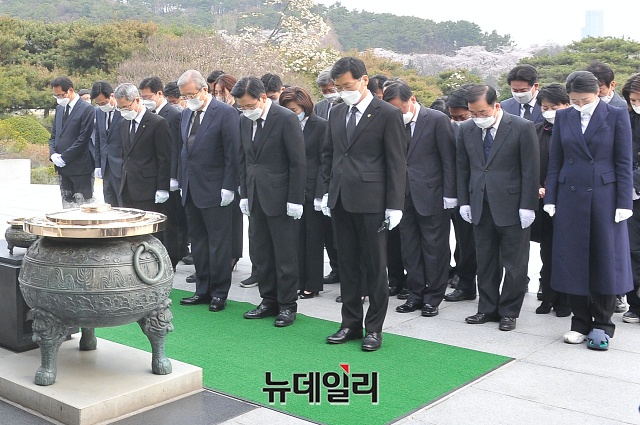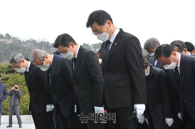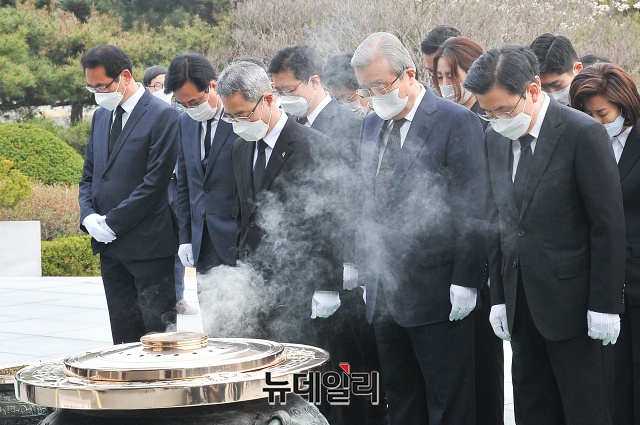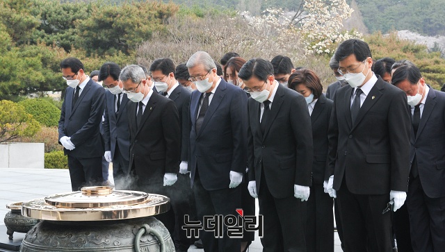황교안 미래통합당 대표와 김종인 총괄선거대책위원장이 1일 오전 서울 동작구 국립서울현충원을 찾아 현충탑에 참배하고 있다.