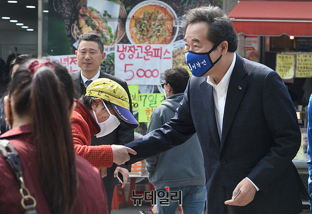 이낙연 더불어민주당 코로나19 국난극복위원장과 김영진 수원시병 후보자가 1일 오전 경기 수원 팔달구 못골시장을 찾아 시장을 둘러보고 있다. (경기 수원=박성원 기자)