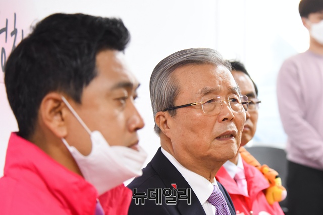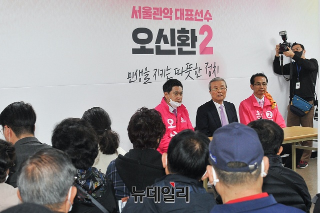 김종인 미래통합당 총괄선거대책위원장이 1일 오후 서울 관악구 관악을 선거사무소를 찾아 오신환 관악을 후보, 김대호 관악갑 후보를 격려하고 인사말을 하고 있다.