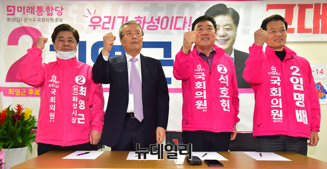 최영근 미래통합당 화성갑 후보(왼쪽부터), 김종인 총괄선대위원장, 석호현 화성병 후보, 임영배 화성을 후보가 1일 오후 경기 화성시 화성갑 선거사무소에서 손을 맞잡고 기념촬영을 하고 있다. 이날 김 선대위원장은 화성시 후보를 격려하기 위해 방문했다. (경기 화성=정상윤 기자)