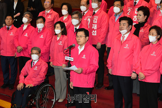 황교안 미래통합당 대표가 1일 오후 국회 로텐더홀 홀 앞 계단에서 열린 미래통합당·미래한국당 '나라살리기, 경제살리기' 공동 선언식에 참석해 인사말을 하고 있다.
