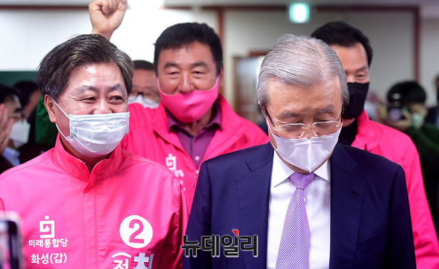 김종인 미래통합당 총괄선대위원장이 1일 오후 경기 화성시 화성갑 선거사무소를 격려방문해 최영근 화성갑 후보, 임영배 화성을 후보, 석호현 화성병 후보와 입장하과 있다. (경기 화성=정상윤 기자)