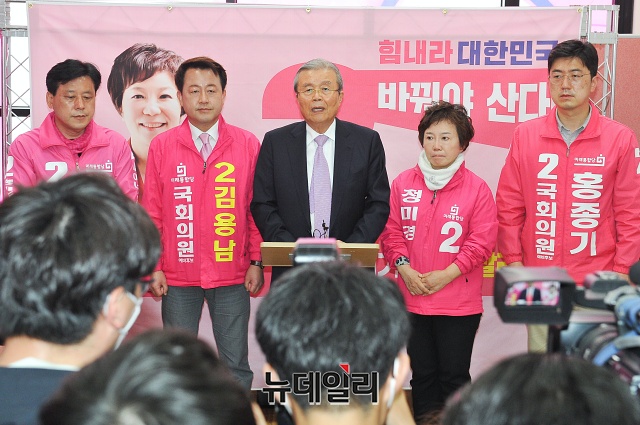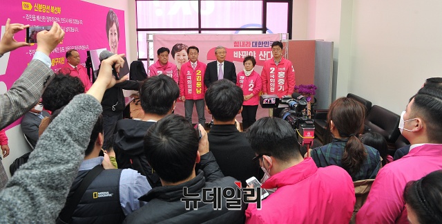 김종인 미래통합당 총괄선거대책위원장이 1일 오후 경기 수원시 수원을 선거사무소를 찾아 정미경 수원을 후보, 김용남 수원병 후보, 홍종기 수원정 후보, 박재순 수원무 후보를 격려하고 인사말을 하고 있다.(경기 수원=권창회 기자)