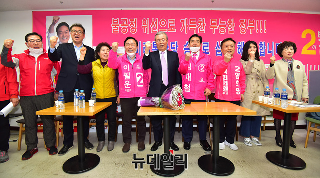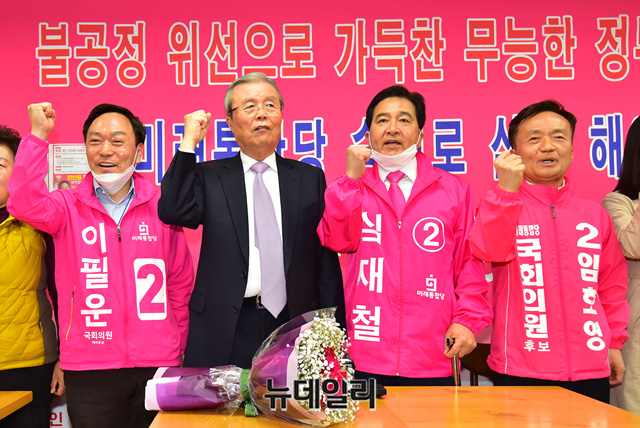 이필운 미래통합당 안양 만안 후보(왼쪽부터), 김종인 총괄선대위원장, 심재철 안양 동안을 후보, 임호영 안양 동안갑 후보가 1일 오후 경기 안양시 만안구 선거사무소에서 총선 승리를 다짐하며 기념촬영을 하고 있다. (경기 안양=정상윤 기자)