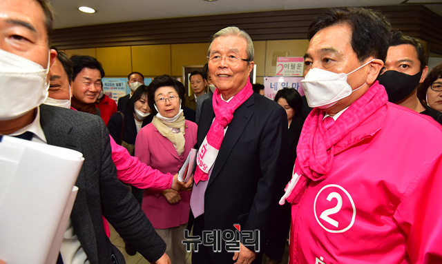 이은재 한국경제당 비례대표 후보가 1일 오후 경기 안양시 만안구 미래통합당 선거사무소를 찾아 김종인 총괄선대위원장과 인사를 나누고 있다. 이날 김 선대위원장은 안양시 후보를 격려하기 위해 방문했다. 이 자리에는 이필운 안양 만안 후보, 심재철 안양 동안을 후보, 임호영 안양 동안갑 후보가 참석했다. (경기 안양=정상윤 기자)