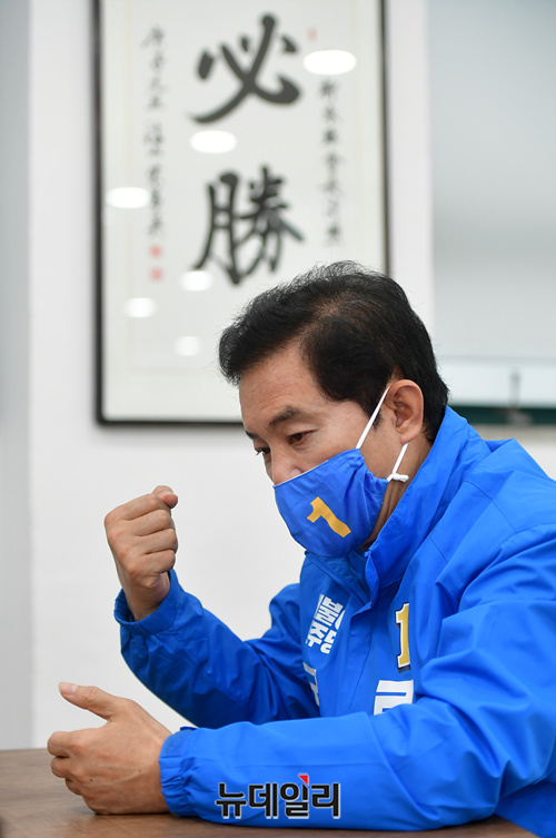 류영진 더불어민주당 부산 진구을 국회의원 후보가 지난달 26일 부산 본인의 사무실에서 선거전략에 대해 뉴데일리와 인터뷰를 갖고 있다. (부산=정상윤 기자)
