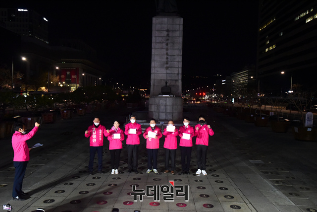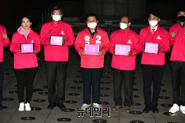 황교안 미래통합당 대표와 박형준·신세돈 공동선대위원장 등 참석자들이 1일 서울 종로구 광화문 광장에서 열린 '나라 살리기·경제 살리기 출정 선언' 기자회견에서 "바꿔야 산다" 구호를 외치고 있다.
