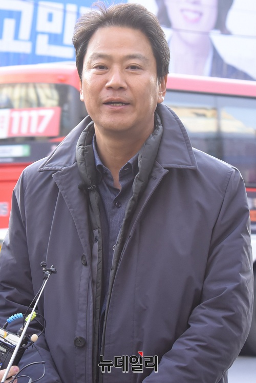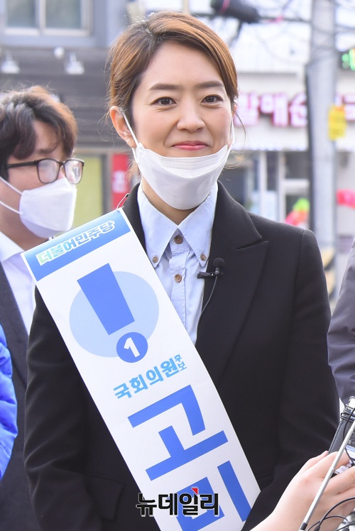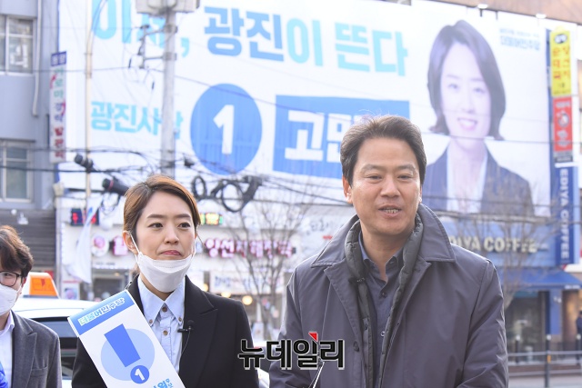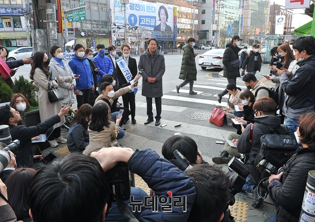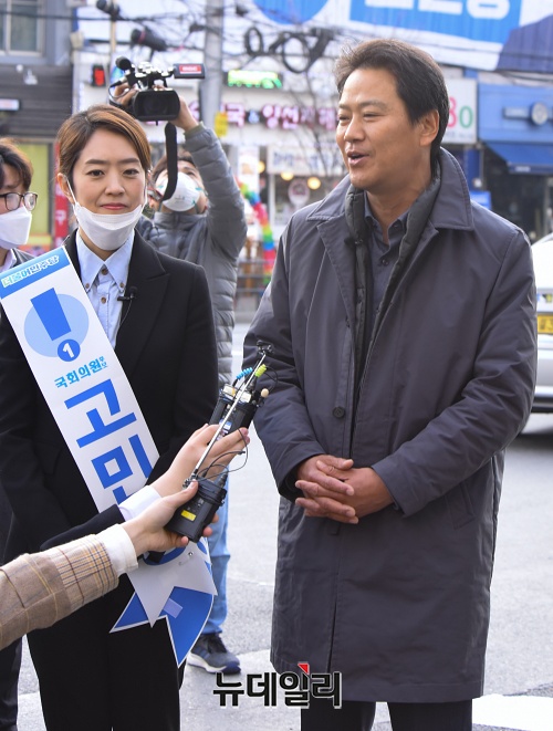 고민정 더불어민주당 광진을 후보 지원 유세에 나선 임종석 전 대통령 비서실장이 2일 오전 서울 광진구 자양사거리에서 취재진의 질문에 답하고 있다.