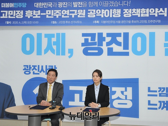 양정철 민주연구원장이 2일 오전 서울 광진구 고민정 선거사무소에서 열린 '고민정 후보-민주연구원 공약이행 협약식'에서 발언하고 있다.