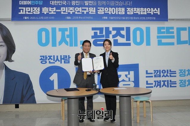 양정철 민주연구원장(왼쪽)과, 고민정 더불어민주당 광진을 후보가 2일 오전 서울 광진구 고민정 선거사무소에서 열린 '고민정 후보-민주연구원 공약이행 협약식'에서 정책협약서를 들고 기념촬영을 하고 있다.