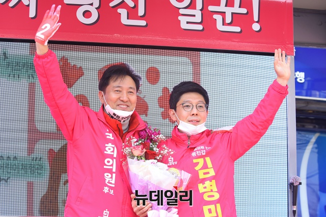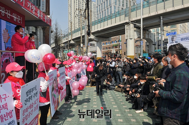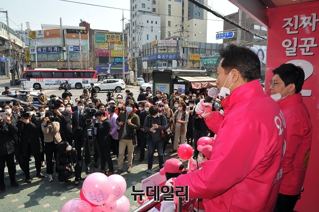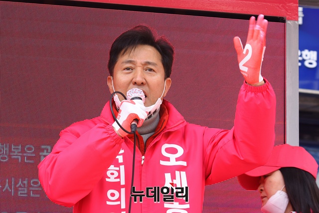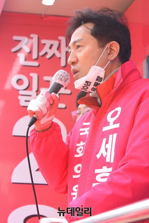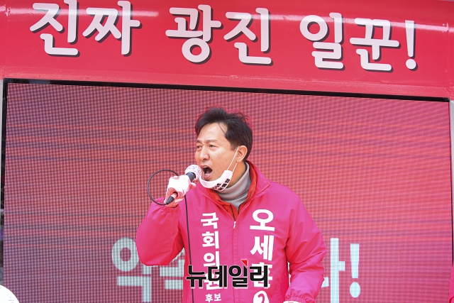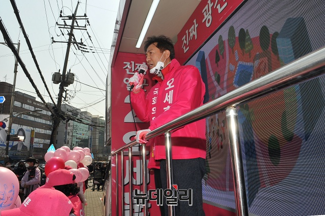 오세훈 미래통합당 광진을 후보가 2일 오전 서울 광진구 자양사거리에서 열린 선거 출정식에서 지지호소를 하고 있다.