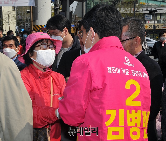 김병민 미래통합당 광진갑 후보가 2일 오전 서울 광진구 자양사거리에서 열린 선거 출정식에서 시민들과 인사하고 있다.