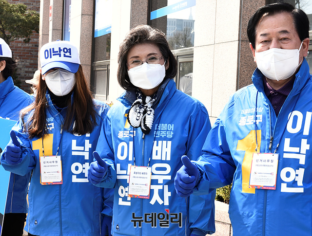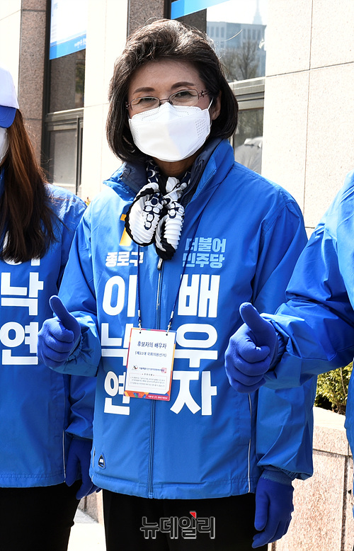 제21대 총선 공식 선거운동 첫 날인 2일 오전 서울 종로구 청운효자동주민센터 앞 사거리에 이낙연 더불어민주당 후보의 배우자가 이 후보의 지지를 호소하고 있다.