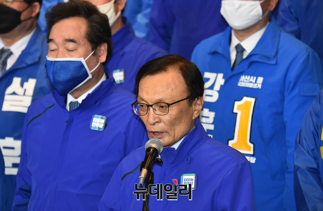 이해찬 더불어민주당 대표가 2일 오후 국회에서 열린 더불어민주당·더불어시민당 제21대 총선 중앙선대위원회 공동 출정식에서 발언을 하고 있다.