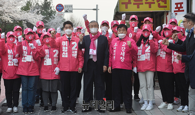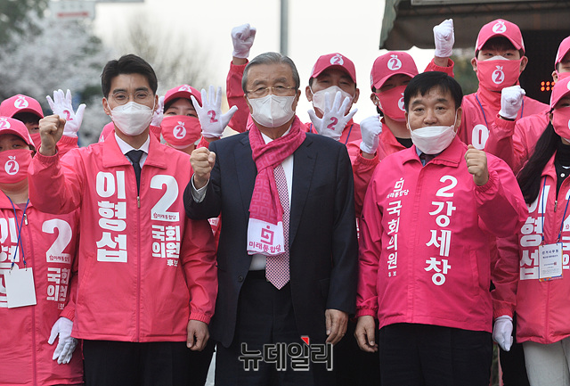 김종인 미래통합당 총괄선대위원장이 2일 오후 경기 의정부시 강세창 의정부시갑 후보자의 선거사무실 앞에서 강 후보와 이형섭 의정부시을 후보자와 함께 총선승리를 다짐하며 기념촬영을 하고 있다. (경기 의정부=박성원 기자)