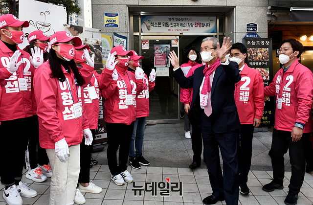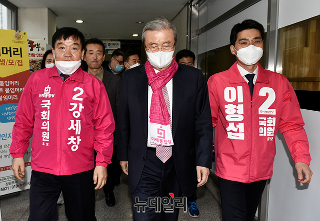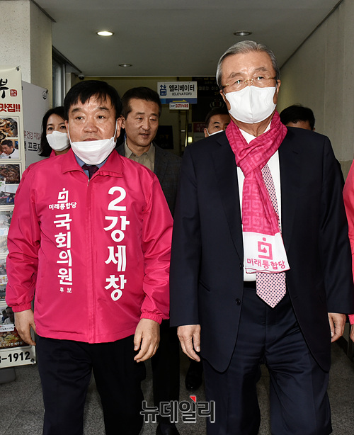 김종인 미래통합당 총괄선대위원장이 2일 오후 경기 의정부시 강세창 의정부시갑 후보자의 선거사무실에 격려방문한 뒤 강 후보와 이형섭 의정부시을 후보자와 함께 사무실을 나서고 있다. (경기 의정부=박성원 기자)